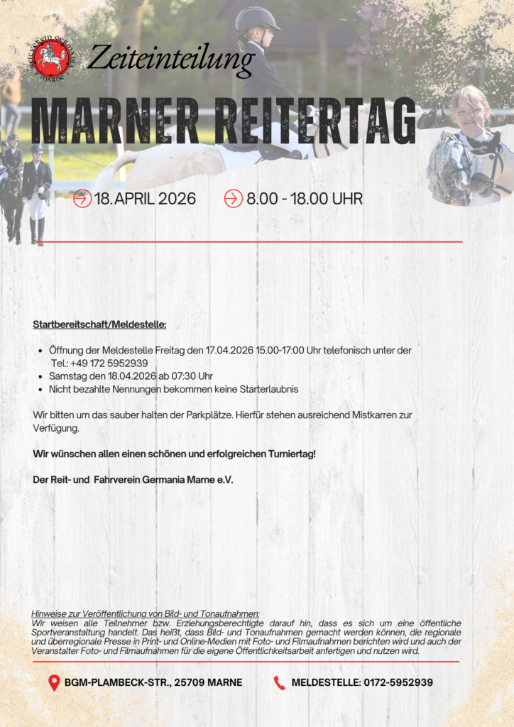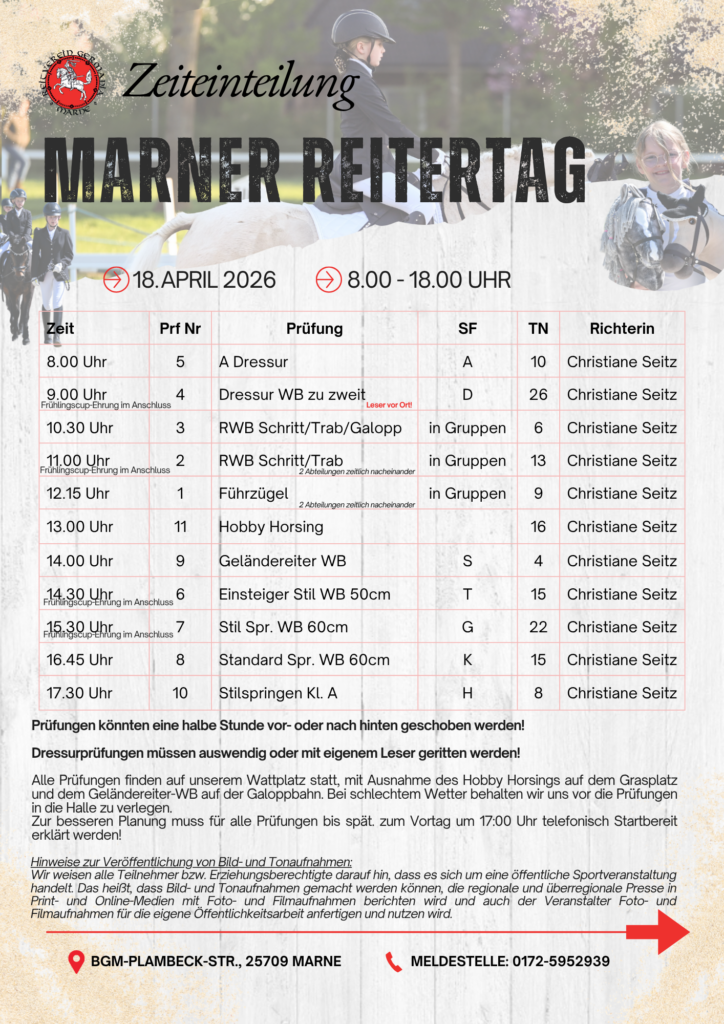 Endlich! Die Turniersaison startet in Marne wieder Traditionell mit dem Hausturnier am 18. April. Nach der Premiere vom letzten Jahr ist auch wieder der Mini-Children Cup des Reiterbundes Dithmarschen dabei. Neu dabei ist der Frühlingscup mit dem Finale in Marne.